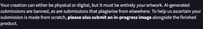 Your creation can either be physical or digital, but it must be entirely your artwork. AI-generated submissions are banned, as are submissions that plagiarise from elsewhere. To help us ascertain your submission is made from scratch, please also submit an in-progress image alongside the finished product.