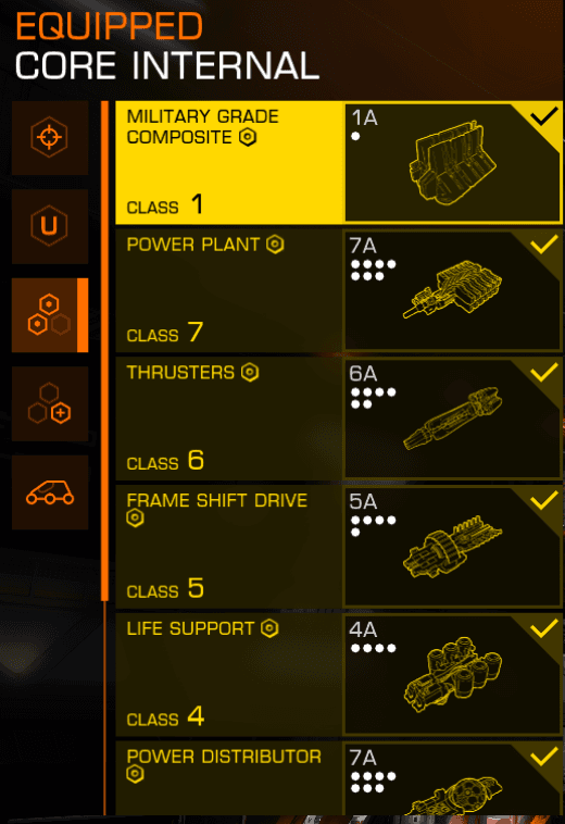 For my core I went with a strong Armou, a Military Grade to face the thoughts pirates, a huge power plant armoured to get extra protection, the brand new FSD SCO that I have gained to help the Cocijo destruction, a fast power distributor since I have a lot of laser that draw a lot o power when I shoot with them, and for sensors and Life support I choose the D class to reduce the energy consumption.