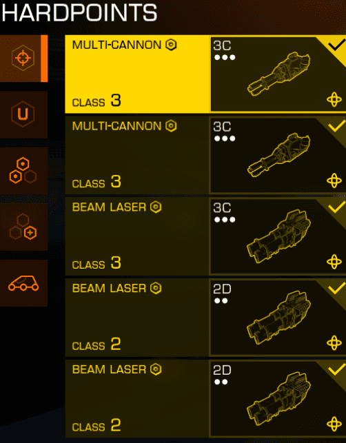 For the hardpoints I decided to go simple, since I'm not an expert in combat, so I choose beam lasers to all times, shield and yet efficient against hulls and multi cannons to accelerate the hull destruction of my enemies.