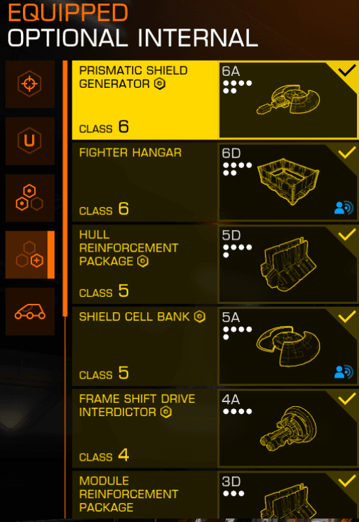 Prismatic Shields have Thermal Resistant Shields modification, Hull reinforcement is Heavy Duty, Frame Shift Drive Interdictor has expanded FSD arc.