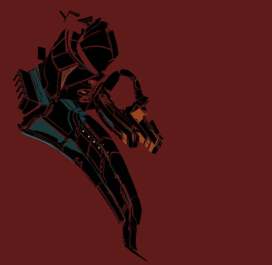 A few months ago I finally had a short break in the production of the board game. I was right in the middle of creating hundreds of pieces of art for cards and everything that the game needed and constantly fighting against creative burn-out. So I decided to create two new pieces in an entirely new technique. This piece above is of the new Havoc spaceship the Khizriel (there is one of the Mekubal as well) and I created these in a Frank Miller inspired graphic style using purely flat shapes.