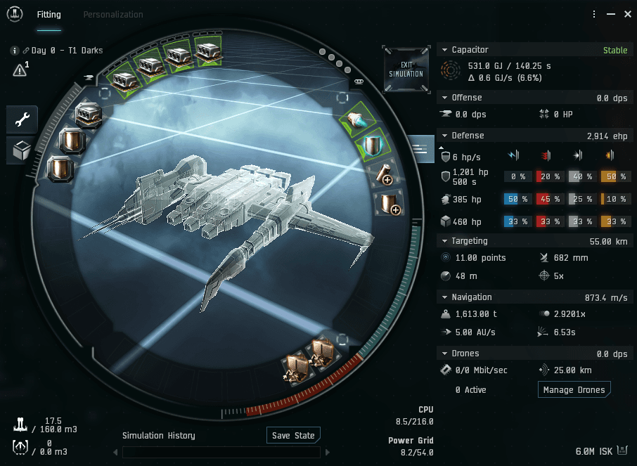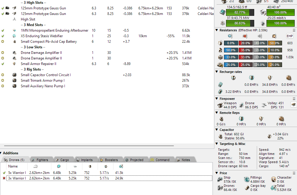 It's a very cheap fit, with a price tag around 5 million ISK using simple T1 drones. However, if you have the budget, I recommend faction drones due to their superior health and extra damage.