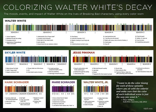 One detail in Breaking Bad that’s often overlooked but is absolutely brilliant is the color symbolism throughout the series. Vince Gilligan, the show’s creator, uses colors in the characters' clothing and surroundings to subtly communicate their psychological states and arcs.
