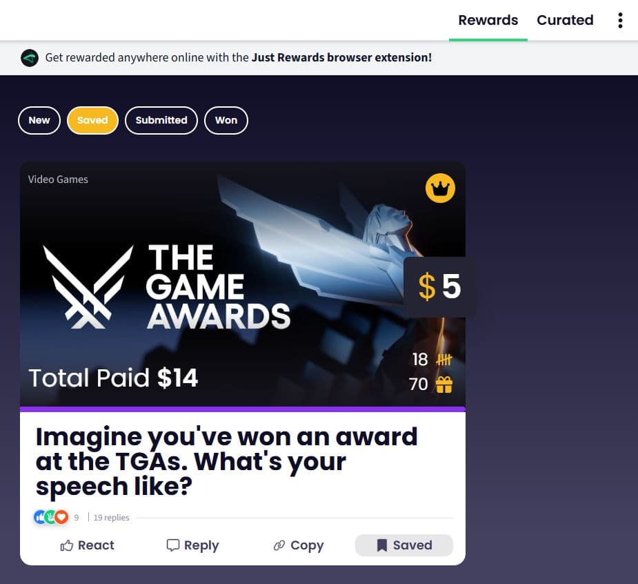 A further word on the ‘saved’ filter. You can already save any post on the platform (whether it be an article, reward, discussion thread, or comment), and review them at this tab within your activity panel. But with the addition of this filter on the rewards feed, this feature gets a new context that we expect will make it much more useful to you all. Now you can bookmark rewards of interest and review them from a feed that you (probably) use much more often!