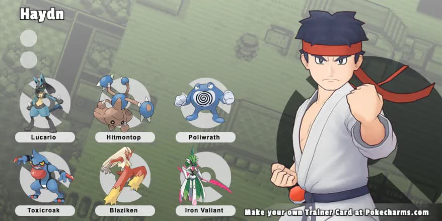 There are a lot of dual types here, which Scrbzy explains is to "exploit any weaknesses" his opponents have, so you'll need to also deal with water-type moves from Poliwrath, poison-type moves from Toxicroak, fire-type moves from Blaziken, and fairy-type moves from Iron Valiant. Get through all of those, along with Hitmontop to start, and you'll face off against Lucario, one of the highest base attack Pokémon there is. Good luck!