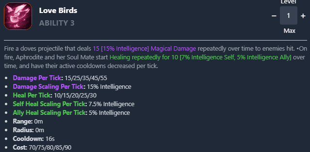 Love Birds: Fire a doves projectile that deals Magical Damage over time to enemies hit, if you are linked with a soul mate, Aphrodite and her Soul Mate start Healing over time and have their active cooldowns decreased per tick.