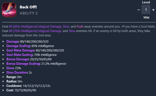 Back Off: Deal Magical Damage, Slow, and Push away enemies around you. If you have a Soul Mate, Deal Magical Damage, Slow, and Push away enemies around them as well