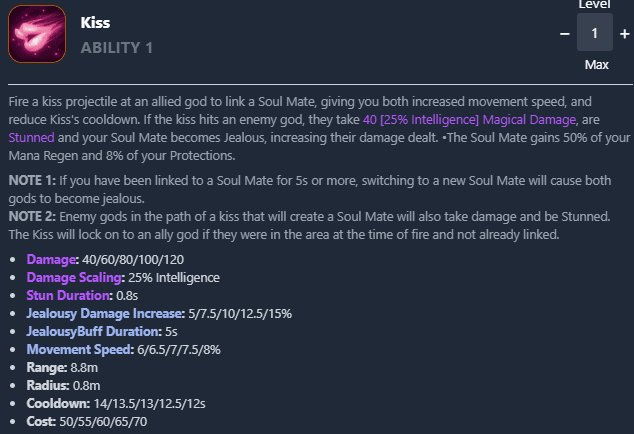 Kiss: Fire a kiss at an allied God to link a Soul Mate, giving you both increased movement speed, and reduced Kiss's cooldown, if the kiss hits an enemy God, they take Magical Damage, are Stunned, and your Soul Mate becomes Jealous, increasing their damage dealt. The Soul Mate gains 50% of your MP5 and 10% of your Protections.