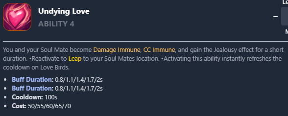 Undying Love: You and your Soul Mate become Damage Immune, CC Immune, and gain the Jealousy effect for a short duration. Reactivate to Leap to your Soul Mates location.