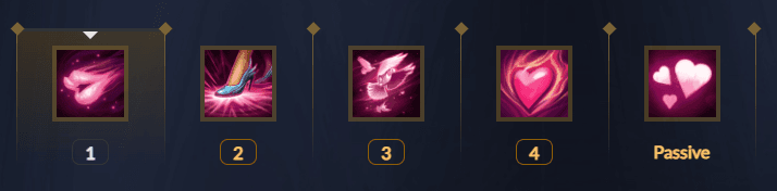 Kiss: Fire a kiss projectile at enemies or allies, if you hit allies you link them with you and become a soulmate giving you both increased movement speed, and reduced kiss cooldown. If the kiss hits and enemy he will get stunned and take magical damage, when you kiss an enemy the ally you are linking with becomes Jealous, increasing the damage dealt.