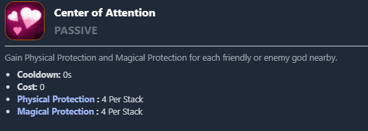 passive(Center of Attention): Gain Physical Protection and Magical Protection for each friendly or enemy God nearby.