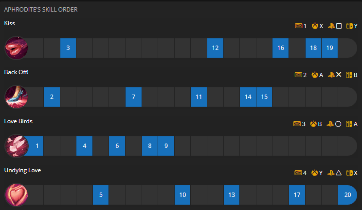 Aphrodite should always start an interaction by being linked to a teammate as long as one is nearby. She can then follow up in a fight by using kiss again to stun the enemy and buff her ally with jealousy. With the enemy stunned her and her ally can jump onto the enemy and use Back Off! to deal damage and further separate the enemy from their own team. Aphrodite can now use Love Birds to deal more damage, lower her and her allies cooldowns as her other abilities have been used now, and she and her ally have probably taken some damage at this point that can be healed. If the enemy team does enough damage to your team, or they use their ultimate, Aphrodite can use Undying Love to heal and protect her teammate and ensure survival and win the fight.