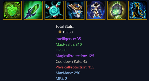 Sixth and final item, for this point the last item can vary depending on whether we want more intellect for greater healing or more defense, in this case, being defensive, we will implement the item "Magi's Cloak" which provides us with magic and physical defense, along with activation reduction and its useful passive if we are the center of attention of the enemies, which provides instant immunity to a loss of character control with an immunity of 1.5 seconds during that time, but with a reactivation time of 90 seconds.