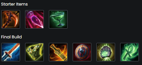 As for solo builds, I like to use items such as Berserker Shield for mixed defenses and attack speed, Qins Blade to guarantee additional damage, Dagger of Frenzy, Bumbas Spear... and some situational items such as Shogun's Kusari and Cloak of Discord. I think it's a great option to play, but with regard to some negative points I would say the dependence on skills, which generates the need to manage mana, as well as its vulnerability to CC.