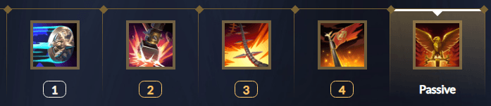Ultimate - Eagle's Rally: Jump forward and plant a flag in the ground, dealing damage and stunning enemies, as well as strengthening allied gods in the area with Intelligence, strength and protections.