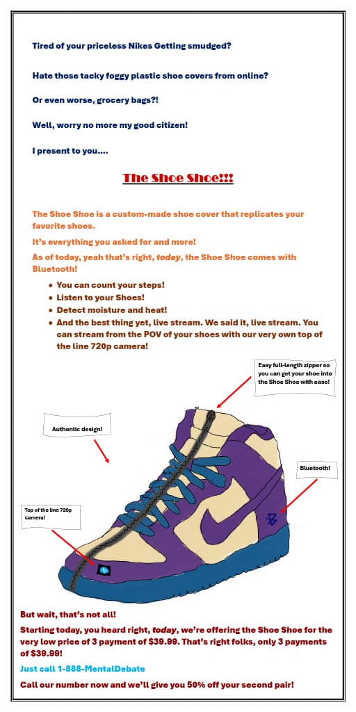Make a funny spoof advert for a totally impractical and useless new technology item, but sell it like it's the best thing ever invented. List, show, or demonstrate all the "super useful" features it has, when really they're rubbish.