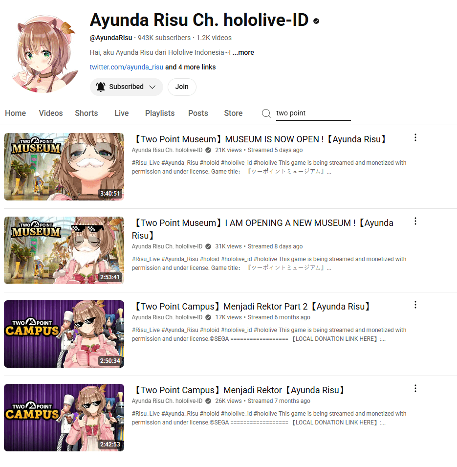 I'm excited to share Ayunda Risu's livestream content for Two Point Museum! Even though it's a chill playthrough, her lively reactions and cheerful vibe make exploring the game even more fun and heartwarming.