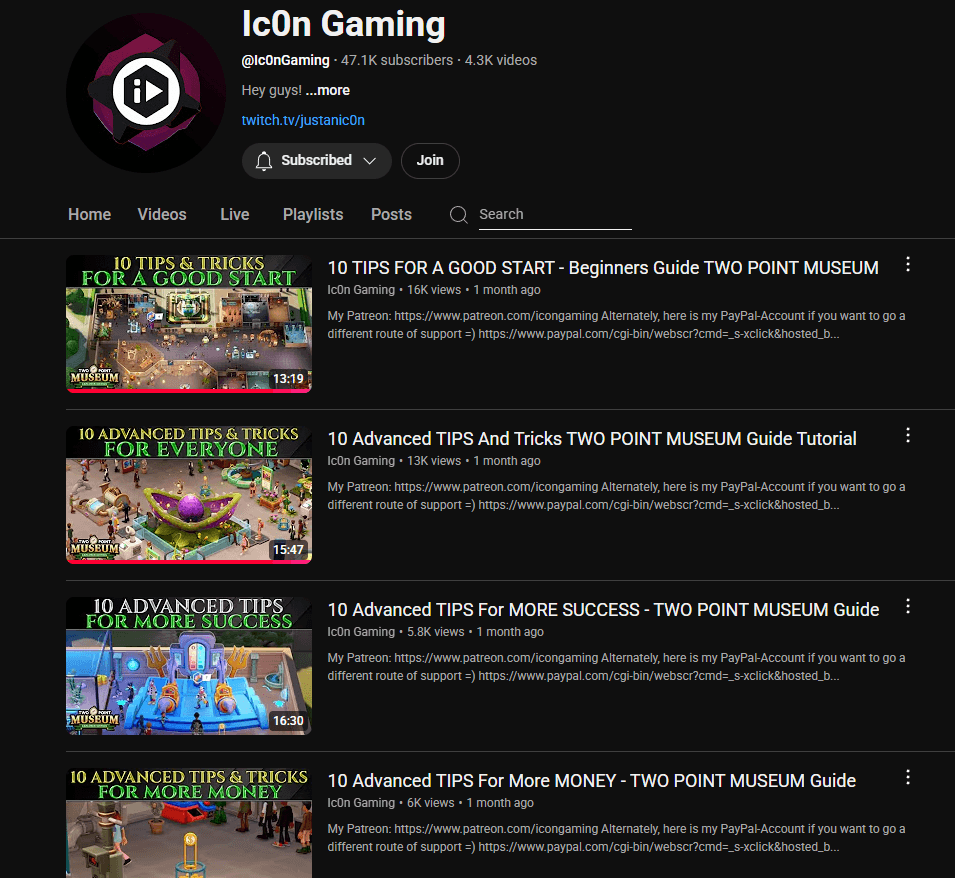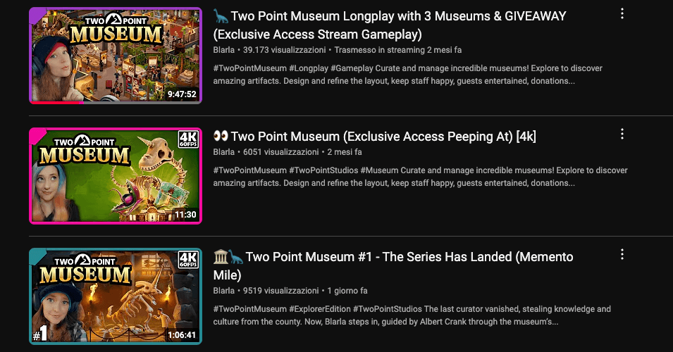 I would definitely choose this creator. I like it because he has already treated other variants of this type of game very well in the past (such as hospital) and he also started with two point museum by showing the dynamics, describing every single detail perfectly and also giving advice on how to best approach each element inserted in the game. He shows the various menus, the elements to use where and when and he does it clearly.