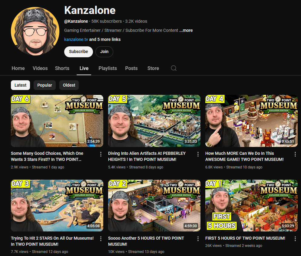 Found out about Kanzalone a couple weeks ago for his Stardew playthrough but recently he started streaming Two Point Museum too and it actually got me into the game as well. He's a pretty chill guy and his stream is cozy to wind down to after a day of work for me.