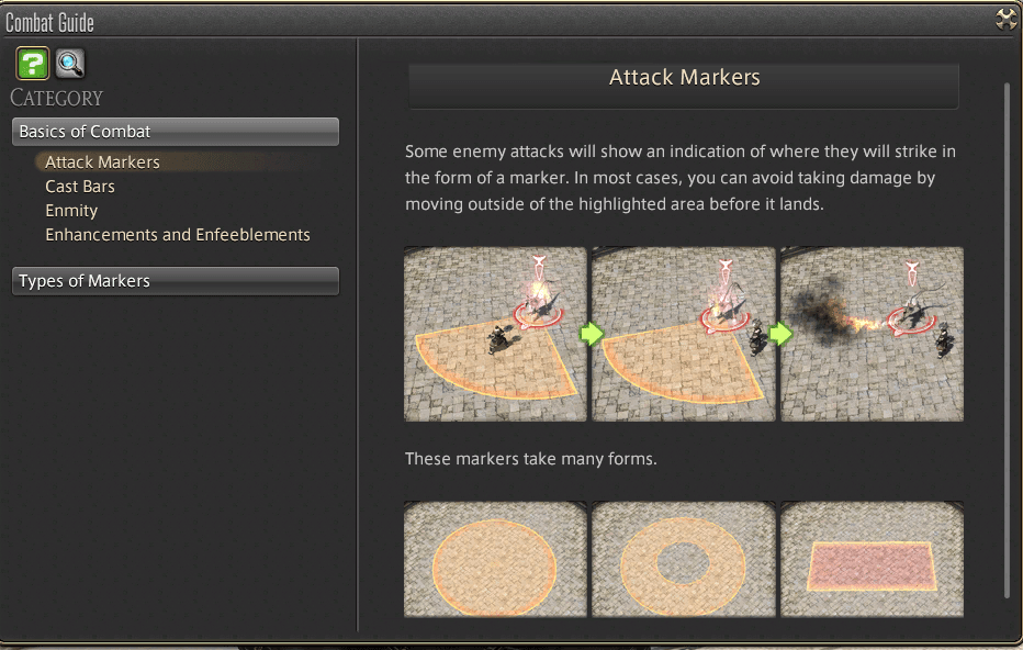 I would be already very happy with these exercises, but we also got a new Combat Guide which can be opened from the Hall of the Novice menu and it explains various markers which players can encounter. It is definitely not a complete list and doesn't include unique markers seen in high-end content, but it's very useful for new players who might not understand these markers easily when they first encounter them.